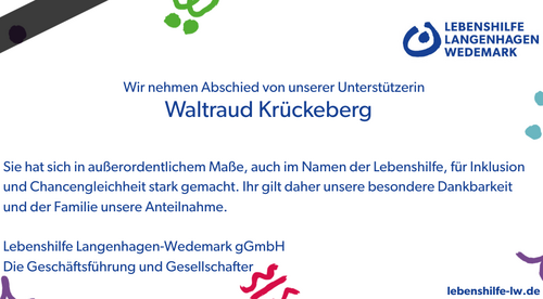Waltraud Krückeberg, Ehrenbürgerin der Stadt Langenhagen, hat sich - neben ihrem politischen Engagement (Bürgermeisterin von 1986-2001) - stark gemacht für die Menschen der Lebenshilfe, die durch uns begleitet werden. Besonders eingesetzt hat sie sich für den Lindenhof und seine Mieter*in.
